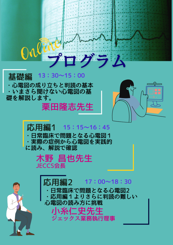 オンライン(Zoom)で 基礎から応用まで、1日で学ぶ「心電図集中講座」です。ご自宅などからオンラインで聴講いただけます。