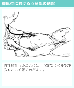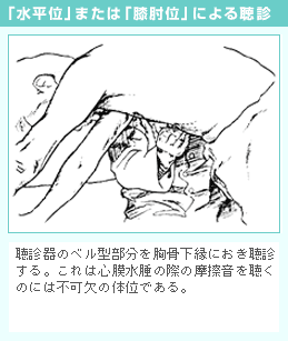 これらの場合は心尖拍動は左下方に変移する。心雑音の他にIV音、I音、II音そしてIII音などの有無や、時には「心膜摩擦音」も聴くことができる。